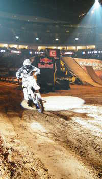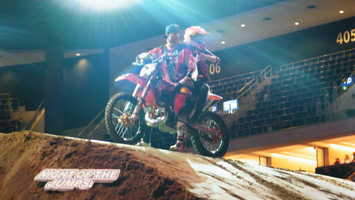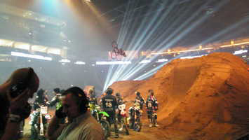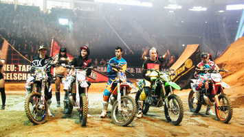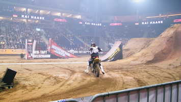 Der Moderator des Abends stellt sich und anschließend die Jury vor. Anschließend werden die Fahrer einzeln in die Halle gebeten, um eine kleine Runde zu fahren, sich möglichst prominent in die Mitte der Halle zu stellen und für das Publikum zu posieren - wobei dies eher für die Kameras am unteren Rand geschieht. Die Zuschauer auf der gegenüberliegenden Seite der Halle bekommen hier nur die Rücken der Fahrer zu sehen. Optimal fände ich das als Zuschauer auf der "falschen Seite" nicht wirklich. Die Stimmung auf den Rängen ist dennoch relativ ausgelassen, könnte aber für diese Location durchaus ein wenig präsenter sein. Nachdem die Fahrer nun ausgiebig gefeiert wurden, geht es also los. Es folgt die Erklärung, wie der Abend verläuft. Ein Durchgang über 1:30 Minuten, die jedem Fahrer zur Verfügung steht, so viele Tricks wie möglich zu zeigen, um möglichst viele Punkte zu erreichen, soll folgen. Dies ist somit die Qualifizierung für das Finale (ja, es gibt nur 2 Runden). Hier läuft alles sehr geordnet ab und man beobachtet die Fahrer bei zwar halsbrecherischen Sprüngen wie Backflips, Supermans und anderen Showeinlagen - welche durchaus beeindrucken - aber generell wirkt die Stimmung noch nicht, als wäre sie auf dem Siedepunkt. Hier hatte ich mehr Show, mehr Feuerwerk und eine gewaltigere Inszenierung erwartet. Recht nett gemacht ist der "Hot Seat". Nach jeder einzelnen Runde eines Fahrers werden die erreichten Punkte durchgesagt und der zurzeit Führende darf sich auf dem Podest beim Moderator auf einen elektrisch nach oben fahrenden Stuhl setzen und das Event von dort aus beobachten. Leider ist der Gesamtführende des ersten Durchgangs schon relativ früh dran und die Wechsel auf dem Stuhl bleiben aus. Das ist der Spannung leider nicht sonderlich förderlich. Nachdem alle Fahrer der Reihe nach ihre Spuren im Dreck hinterlassen haben und das Dröhnen der Motoren langsam verklingt, liegt nur noch der Schall des Publikums in der Luft.