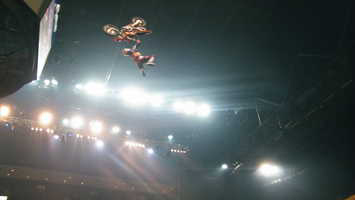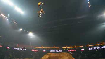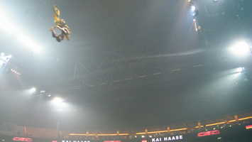 Dann werden die Mountainbiker angekündigt, welche eine super Show hinlegen: Double-Backflip, Superman, Wheeltwist und wie sie nicht alle heißen. Die Stunts, die hier vom Stapel gelassen werden, sind schon nicht ohne. Apropos "ohne": Ohne die Motorengeräusche und mit nur etwas Musik im Hintergrund wirkt die Inszenierung beim Anblick der kleinen Fahrräder in der großen Halle jedoch etwas deplatziert und einsam - vor allem von den oberen Rängen. In einer kleinen Skateboard-Halle, wenn man näher am Geschehen ist, würde dieses Spektakel mit Sicherheit wesentlich intensiver und beeindruckender wirken. Nichtsdestotrotz ziehe ich meinen Hut vor der Leistung der Fahrer.