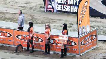 Bei Betreten der Halle gegen 18 Uhr ist dieses Bild jedoch zunächst komplett verblichen. Wenngleich der Beginn der Show noch zwei Stunden hin ist, wirkt die Halle eher, als hätten alle fluchtartig das Weite gesucht. Alles ist aufgebaut, doch die Zuschauerränge sind leer. Bis circa 19:30 ist das Fahrerlager zugänglich - auch für Zuschauer. Also nichts wie hin. Unter der Voraussetzung, dass man sich vorher das offizielle Tour-Magazin gekauft hat, bekommt quasi jeder Zugang zum "Boxenlager". Für Familien mit Kind/ern reicht auch 1 Heft - ein feiner Zug. Hier findet schon eher ein - wenn auch noch nicht sonderlich reges - Treiben statt. Es werden ein paar Erklärungen zu den Motorrädern und deren Spezifikationen auf einer kleinen Bühne vorgestellt. Zwischendurch laufen - aus der Nähe leider eher mäßig gutaussehende - Boxen-Girls umher und lassen sich mit den Zuschauern fotografieren. Auch die Fahrer stehen für kurze Gespräche und Fotos zur Verfügung. Prinzipiell wirkt das Ganze aber wie ein presse- und werbeaktives, leicht aufgesetztes Grinsen für die Kamera, als eine Unterhaltung der Zuschauer. Eigentlich schade - hier hätte man mehr rausholen können. Mit der Zeit wird es so voll in den kleinen Backstage-Räumlichkeiten, in denen das Fahrerlager aufgebaut ist, dass man kaum noch vorankommt. Zeit, das Ganze auf sich wirken zu lassen und in Ruhe die Motorräder zu bestaunen, geschweige denn zwei Worte mit den Fahrern zu wechseln, bleibt da dann leider auch nicht - zumal Fotografen, Presse-Leute und Zuschauer gleichermaßen von allen Seiten schieben.