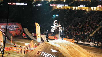 Das komplett gegenteilige Bild zur Box bietet sich allerdings, wenn man (ja, auch noch sehr kurz vor Beginn der Show) einen Blick auf die Ränge wirft. Es könnte voller sein - immerhin ist die Night Of The Jumps die offizielle Weltmeisterschaft des Freestyle Motocross und feiert mittlerweile ihr 13-jähriges Bestehen. Mit Events auf drei Kontinenten (Europa, Asien und Südamerika), also z.B. in China, Brasilien, Russland, der Ukraine und vielen europäischen Staaten, zählt sie immerhin zu den größten und bekanntesten Veranstaltungen dieser Art und ist ein Aushängeschild der professionellen Sport-Szene.