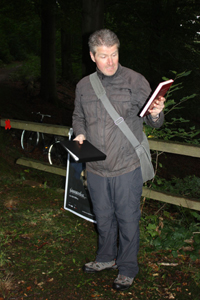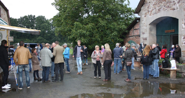 Am alten Rathaus in Uslar eingetroffen, wurde ich bereits vom Orga-Team begrüßt und sogleich mit wichtigen Informationen und dem dazu gehörigen Survival-Paket versorgt. Der Literatur- und Kunstkreis Uslar e.V. hatte die Organisation vor Ort mit übernommen. Nachdem uns VGH-Intendantin Susanne Mamzed und Uslars Bürgermeister Bauer willkommen geheißen hatten, starteten wir in Gruppen von je 8-10 Teilnehmern zeitversetzt auf unterschiedlichen Routen. Da ich in der letzten Gruppe mitlief, blieb noch genug Zeit, um mit einigen Mitstreitern ins Gespräch zu kommen und sich über so manches Abenteuer auszutauschen. Die Strecke war gut mit Wegweisern präpariert, so dass wir den im Survivalpaket befindlichen Kompass gar nicht benötigten. Zunächst ging es zu drei Vorlesestationen innerhalb der Stadt, bevor wir auf einem Wald-Trimmpfad Richtung Ziel, einem urigen Gehöft, weiter wanderten. Das Wetter war zwar feucht, aber in Strömen geregnet hat es Gott sei Dank nicht.
